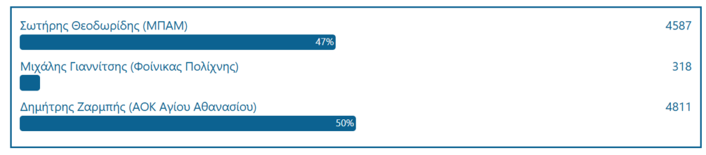 Ο Δημήτρης Ζαρμπής του ΑΟΚ Αγίου Αθανασίου για 90 λεπτά ήταν πολύ καλός τόσο στα αμυντικά όσο και στα επιθετικά του καθήκοντα «οργώνοντας» το γήπεδο. «Έκανε» πολλές άμυνες, προωθούσε σχεδόν αλάνθαστα την μπάλα μπροστά και βοήθησε πολύ στο επιθετικό κομμάτι σημειώνοντας χατ τρικ. Σύμφωνα με αντιπάλους και συμπαίκτες, δικαιούται μια θέση στους υποψήφιους MVP.